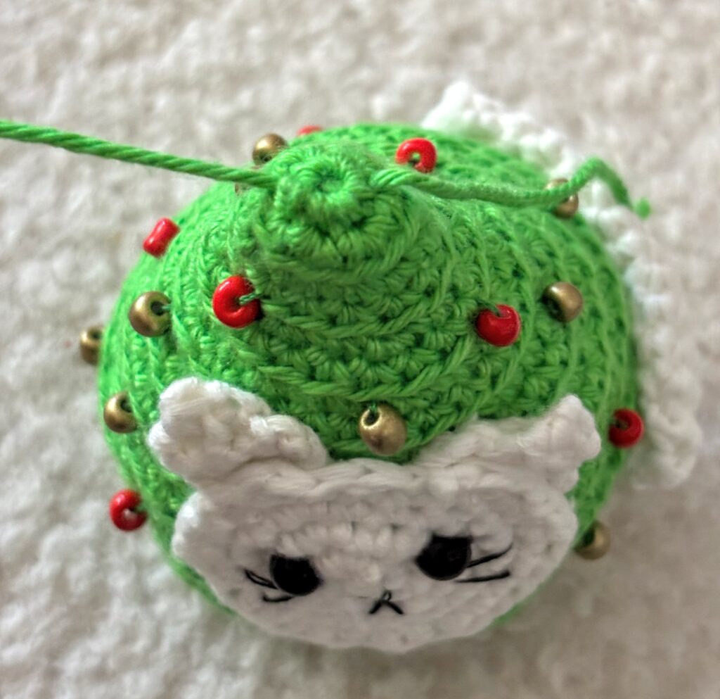 Just above your last BLO round, sew on the tail. The end of the tail will be the dec 3 side which should be the closest to the face. Sew the tail around the tree so it looks as if the tail is coming out of the back. Hide all ends inside the tree.