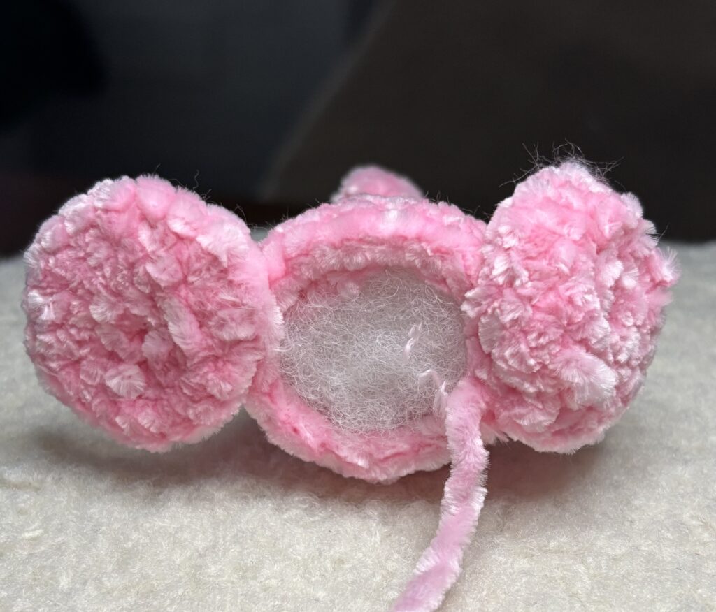 Take a tapestry needle and attach your ears on each side of the head through sc 3.